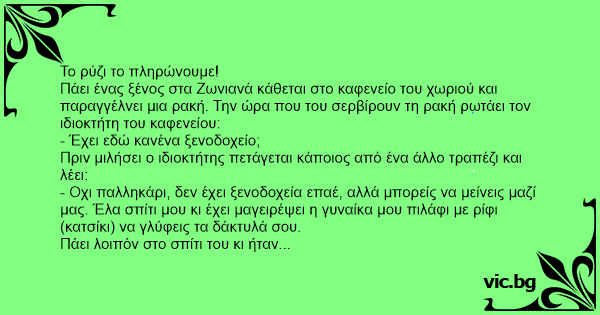 Πάει ένας ξένος στα Ζωνιανά κάθεται στο καφενείο του χωριού και παραγγέλνει μια ρακή. Την ώρα που του σερβίρουν τη ρακή ρωτάει τον ιδιοκτήτη του καφενείου: