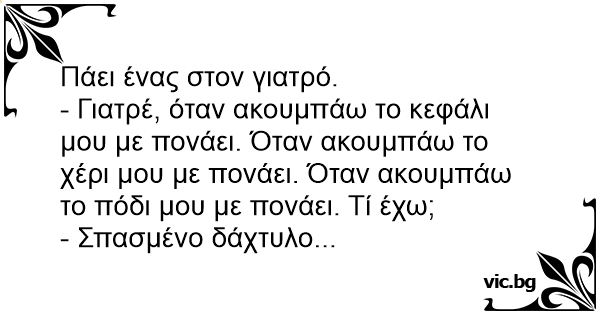 - Γιατρέ, όταν ακουμπάω το κεφάλι μου με πονάει. Όταν ακουμπάω το χέρι μου με πονάει. Όταν ακουμπάω το πόδι μου με πονάει. Τί έχω;