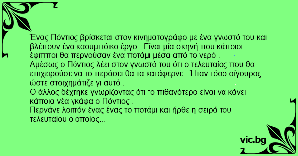 Ένας Πόντιος βρίσκεται στον κινηματογράφο με ένα γνωστό του και βλέπουν ένα καουμπόικο έργο . Είναι μία σκηνή που κάποιοι έφιπποι θα περνούσαν ένα ποτάμι μέσα από το νερό .
