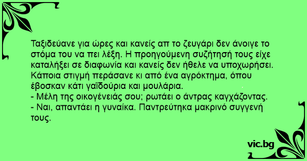 Ταξιδεύανε για ώρες και κανείς απ το ζευγάρι δεν άνοιγε το στόμα του να πει λέξη. Η προηγούμενη συζήτησή τους είχε καταλήξει σε διαφωνία και κανείς δεν ήθελε να υποχωρήσει. Κάποια στιγμή περάσανε κι από ένα αγρόκτημα, όπου έβοσκαν κάτι γαϊδούρια και μουλάρια.