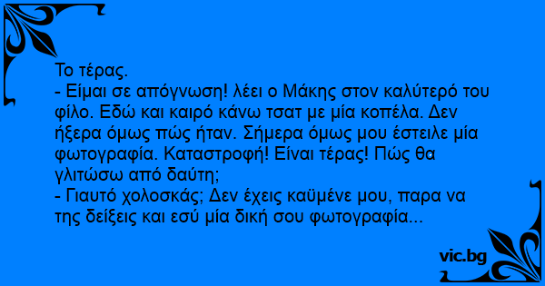 - Είμαι σε απόγνωση! λέει ο Μάκης στον καλύτερό του φίλο. Εδώ και καιρό κάνω τσατ με μία κοπέλα. Δεν ήξερα όμως πώς ήταν. Σήμερα όμως μου έστειλε μία φωτογραφία. Καταστροφή! Είναι τέρας! Πώς θα γλιτώσω από δαύτη;