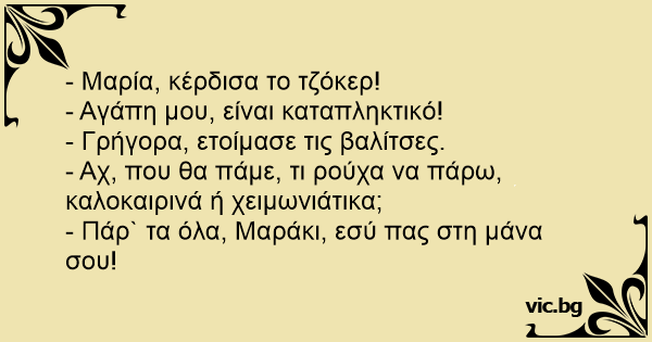 Lottery Haz las maletas que me ha tocado la loteria Im Lotto gewonnen Το λαχείο Τα κέρδη του ΛΟΤΤΟ... Ετοίμασε τις βαλίτσες... Пиян мъж се прибира в 4: 30 през нощта, влиза в спалнята и започва да буди жена си: Die Frau rennt ins Haus, schmeisst die Türe hinter sich zu und schreit: Un señor llega gritando a su casa: Ascoltando i risultati delle partite di calcio alla radio, un uomo si accorge di aver fatto un tredici milionario. Super entusiasta urla alla moglie: A woman came home, screeching her car into the driveway, and ran into the house. She slammed the door and shouted excitedly, "Honey, pack your bags. I won the lottery!" The husband said, "Oh my God! What should I pack, beach stuff or mountain stuff?" "Doesn't matter," she said, "Just get out." Mann kommt nach Hause: "Schatz, Schatz, pack die Koffer, ich habe im Lotto gewonnen!" Darauf die Frau: "Oh, toll, fahren wir in Urlaub?" Mann: "Nein, du ziehst aus!" "Chérie, chérie, fais tes valises j'ai gagné au loto" fait le mari en rentrant chez lui " - Formidable! je prends mes affaires d'été ou d'hiver" répond la femme " - Les deux : tu fais ta valise et tu te casses" A man rushes into his house and yells to his wife, ‘Martha, pack up your things! I just won the Lottery!’ Martha shouts back, ‘Shall I pack for warm weather or cold?’ The man replies, ‘I don’t... Wygrał facet w totka milion. Wpada do domu i krzyczy: - Jadźka wygrałem milion w totka, pakuj się! - A co? Wyjeżdżamy gdzieś? - Nie! Wypierdalaj! Um homem chega correndo em casa e diz à mulher: — Pode fazer as malas. Ganhei na loteria! E feliz, a mulher pergunta: — Eu preciso pegar roupa de inverno ou de verão? Ele responde: — Pegue todas.... Kommt der Ehemann nach Hause: "Frau, wir haben im Lotto gewonnen! Pack die Koffer!" Darauf seine Frau: "Sommer oder Winterkleidung"? Darauf er: "Ist mir scheißegal, hauptsache du bist in 10 Minuten... Een man heeft een jackpot gewonnen en gaat helemaal opgewonden naar huis. “Truus, pak je koffers maar in” zegt de man. “Wat is er dan aan de hand?” vraagt zijn vrouw. “Ik heb 2 miljoen gewonnen met... O marido chega em casa euforico e fala para a esposa: __ Querida, arrume suas roupas ganhei na loteria. __ E eu devo pegar roupas de inverno ou de verão? pergunta ela. __ Pegue todas, você vai... Mannen ringer hjem til kona: "Jeg har vunnet i Lotto - pakk kofferten!" "Sommer- eller vinterklær?" spør kona. "Det driter jeg i", svarer mannen. "Ut skal du!" Kona i huset kommer løpende hjem, slenger igjen døra og skriker ut, - Kjære, pakk kofferten din. Jeg har vunnet i Lotto! - Utrolig bra!! svarer mannen. - Skal jeg pakke for sjøen eller fjellet? -... Een man komt heel enthousiast thuis: "Trees, pak je koffers, pak je koffers!" "Wat is er dan?" vraagt zijn vrouw. "Ik heb veertig miljoen gewonnen bij de Lotto ," roept de man. "O, wat geweldig,"... Een man komt na een voormiddagje werken terug thuis en roept: "Schat!!! Ik heb de Lotto gewonnen!!! 2,5 miljoen euro!!! Ga vlug naar boven en pak je kleren maar al in!!" De vrouw haast zich naar... En mand kommer løbende ind i sit hus og råber til sin kone: - Skat jeg har lige vundet 5 millioner i lotto. Skynd dig at pakke dine ting.. Konen svarer glad: - Skal jeg pakke varmt tøj eller... - Nevastaaa! Nevastaaa! Fa-ti bagajele! Am castigat un milion de dolari ! - Pentru ce sa-mi fac bagajele? Munte sau mare ? - Nu ma intereseaza, numai sa dispari cat mai repede ! Um homem jogou na loteria e ganhou... Quando chegou em casa disse: — Mulher ganhei na loteria!Ganhei na loteria! Arrume suas malas... E a mulher disse: — Mas amor que roupa eu boto, não sei se vai... El esposo llega a su casa gritando: -¡ Querida, querida! ¡He ganado la lotería! ¡He ganado la lotería! ¡Prepara las valijas! La esposa muy contenta le contesta: -¿ Qué pongo viejo, ropa de... Een man komt uitgelaten thuis. "Truus, ik heb twee ton gewonnen in de Staatsloterij. Ga je koffers maar vast pakken, want dat moet gevierd worden!" Truus: "Zal ik zomer- of winterkleren inpakken?"... C'est un type qui a gagné au loto qui appelle sa femme : - Chérie j'ai gagné 100 millions d'euro, prépare tes bagages . - Est-ce que je prend des vêtements d'hiver ou d'été ? - Je m'en fous, du... Kvinnan kom hem, parkerade sin bil på uppfarten och sprang in i huset. Hon slängde igen dörren och skrek så högt hon kunde: - Älskling packa dina väskor jag har vunnit på lotteriet!!!!! Mannen... Un signore vince alla lotteria 85 milioni di euro. Appena scopre della vincita scappa a casa e dice: "Amore,amore ho vinto al superenalotto, fai le valigie!" E la moglie dice: "Ma è fantastico! ma...