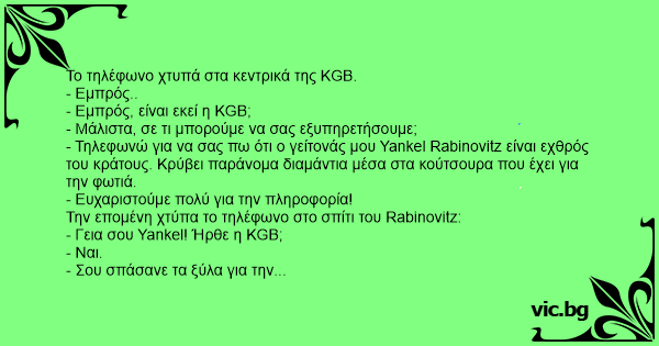 Csörög a telefon a KGB központjában: - Szeretném bejelenteni, hogy Igor Szergejevics a rendszer ellensége. Gyémántokat rejteget a tűzifájában! A KGB azon nyomban kiszáll Szergejevics házához,...