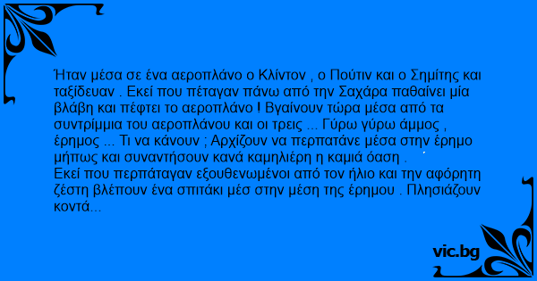 Ήταν μέσα σε ένα αεροπλάνο ο Κλίντον , ο Πούτιν και ο Σημίτης και ταξίδευαν . Εκεί που πέταγαν πάνω από την Σαχάρα παθαίνει μία βλάβη και πέφτει το αεροπλάνο ! Βγαίνουν τώρα μέσα από τα συντρίμμια του αεροπλάνου και οι τρεις ... Γύρω γύρω άμμος , έρημος ... Τι να κάνουν ; Αρχίζουν να περπατάνε μέσα στην έρημο μήπως και συναντήσουν κανά καμηλιέρη η καμιά όαση .