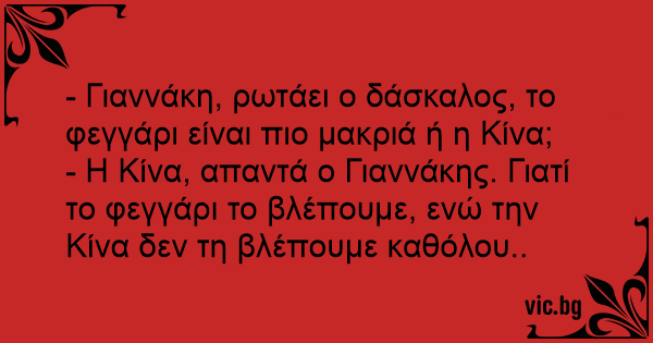 - Η Κίνα, απαντά ο Γιαννάκης. Γιατί το φεγγάρι το βλέπουμε, ενώ την Κίνα δεν τη βλέπουμε καθόλου..