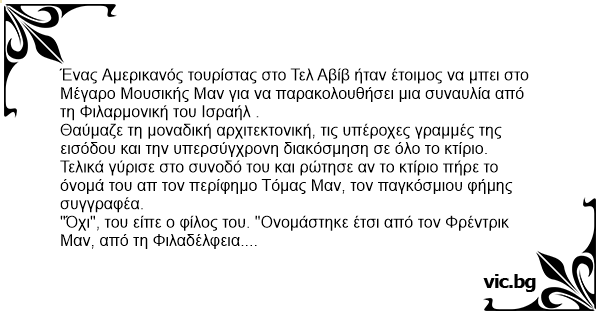 Ένας Αμερικανός τουρίστας στο Τελ Αβίβ ήταν έτοιμος να μπει στο Μέγαρο Μουσικής Μαν για να παρακολουθήσει μια συναυλία από τη Φιλαρμονική του Ισραήλ .