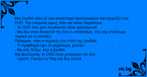 Μια ξανθιά πάει σε ένα κατάστημα ηλεκτρονικών και αγοράζει ένα DVD. Την επομένη όμως πάει και κάνει παράπονα: