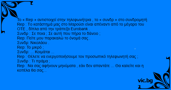 Το « Rep » αντιστοιχεί στην τηλεφωνήτρια , το « συνδρ » στο συνδρομητή Rep : Tο κατάστημά μας στο Μαρούσι είναι απέναντι από το μέγαρο του ΟTE , δίπλα από την τράπεζα Eurobank .