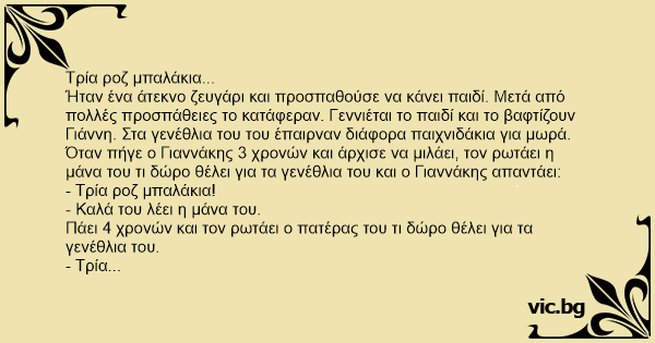 Τι να κάνει η μάνα του, του τα παίρνει. Τελείωσε το δημοτικό, τελείωσε και το γυμνάσιο, κάθε χρόνο ο Γιάννης ζητούσε το ίδιο πράγμα. Τρία ροζ μπαλάκια!