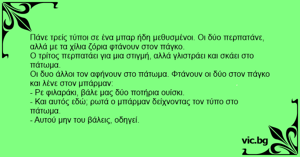 Πάνε τρείς τύποι σε ένα μπαρ ήδη μεθυσμένοι. Οι δύο περπατάνε, αλλά με τα χίλια ζόρια φτάνουν στον πάγκο.