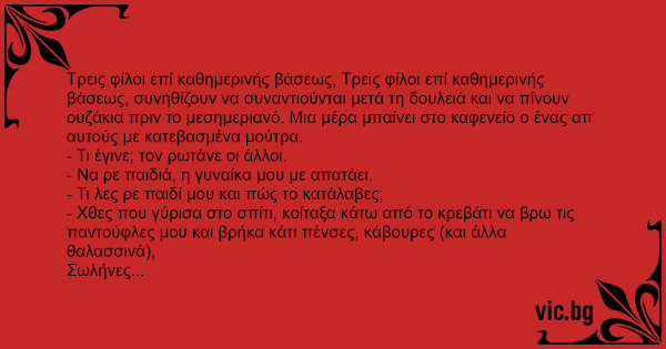 Τρεις φίλοι επί καθημερινής βάσεως, Τρεις φίλοι επί καθημερινής βάσεως, συνηθίζουν να συναντιούνται μετά τη δουλειά και να πίνουν ουζάκια πριν το μεσημεριανό. Μια μέρα μπαίνει στο καφενείο ο ένας απ αυτούς με κατεβασμένα μούτρα.