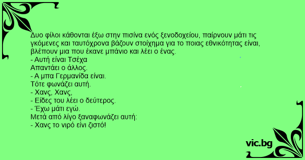 Δυο φίλοι κάθονται έξω στην πισίνα ενός ξενοδοχείου, παίρνουν μάτι τις γκόμενες και ταυτόχρονα βάζουν στοίχημα για το ποιας εθνικότητας είναι, βλέπουν μια που έκανε μπάνιο και λέει ο ένας.