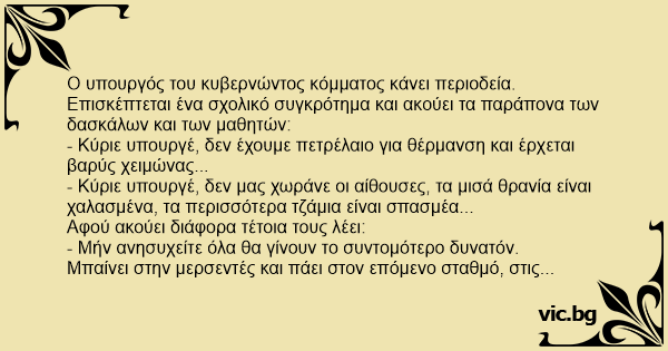 - Κύριε υπουργέ, δεν έχουμε πετρέλαιο για θέρμανση και έρχεται βαρύς χειμώνας...