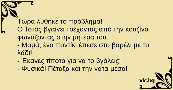 - Μαμά, ένα ποντίκι έπεσε στο βαρέλι με το λάδι!