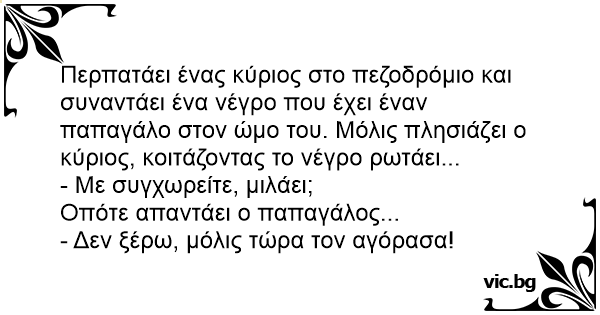 Περπατάει ένας κύριος στο πεζοδρόμιο και συναντάει ένα νέγρο που έχει έναν παπαγάλο στον ώμο του. Μόλις πλησιάζει ο κύριος, κοιτάζοντας το νέγρο ρωτάει...