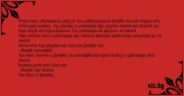 Ήταν ένας υδραυλικός μαζί με τον μαθητευόμενο βοηθό του και πήγαν στο σπίτι μιας κυρίας, της οποίας η μπανιέρα είχε γεμίσει σκατά και έπρεπε με λίγα λόγια να ξεβουλώσουν την μπανιέρα να φύγουν τα σκατά.