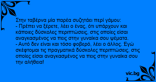 - Αυτό δεν είναι και τόσο φοβερό, λέει ο άλλος. Εγώ σκέφτομαι τις πραγματικά δύσκολες περιπτώσεις, στις οποίες είσαι αναγκασμένος να πεις στην γυναίκα σου την αλήθεια!