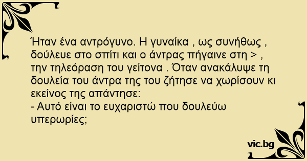 Ήταν ένα αντρόγυνο. Η γυναίκα , ως συνήθως , δούλευε στο σπίτι και ο άντρας πήγαινε στη > , την τηλεόραση του γείτονα . Όταν ανακάλυψε τη δουλεία του άντρα της του ζήτησε να χωρίσουν κι εκείνος της απάντησε: