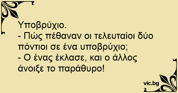 Υποβρύχιο. - Πώς πέθαναν οι τελευταίοι δύο πόντιοι σε ένα υποβρύχιο; - Ο ένας έκλασε, και ο άλλος άνοιξε το παράθυρο!