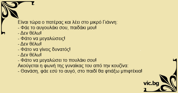 - Θανάση, φάε εσύ το αυγό, στο παιδί θα φτιάξω μπιφτέκια!