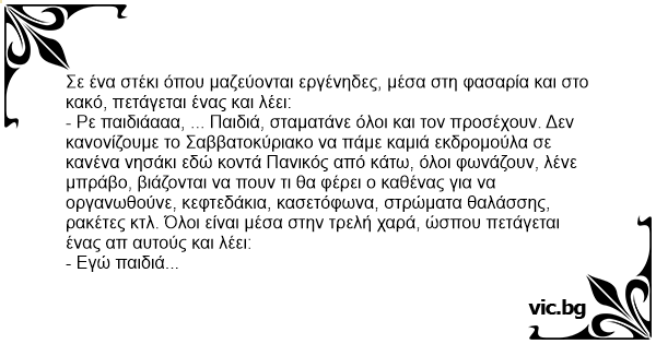 - Ρε παιδιάααα, ... Παιδιά, σταματάνε όλοι και τον προσέχουν. Δεν κανονίζουμε το Σαββατοκύριακο να πάμε καμιά εκδρομούλα σε κανένα νησάκι εδώ κοντά Πανικός από κάτω, όλοι φωνάζουν, λένε μπράβο, βιάζονται να πουν τι θα φέρει ο καθένας για να οργανωθούνε, κεφτεδάκια, κασετόφωνα, στρώματα θαλάσσης, ρακέτες κτλ. Όλοι είναι μέσα στην τρελή χαρά, ώσπου πετάγεται ένας απ αυτούς και λέει:
