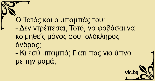 - Δεν ντρέπεσαι, Τοτό, να φοβάσαι να κοιμηθείς μόνος σου, ολόκληρος άνδρας;