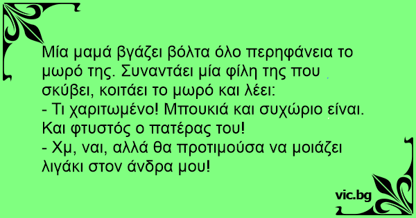Μία μαμά βγάζει βόλτα όλο περηφάνεια το μωρό της. Συναντάει μία φίλη της που σκύβει, κοιτάει το μωρό και λέει: