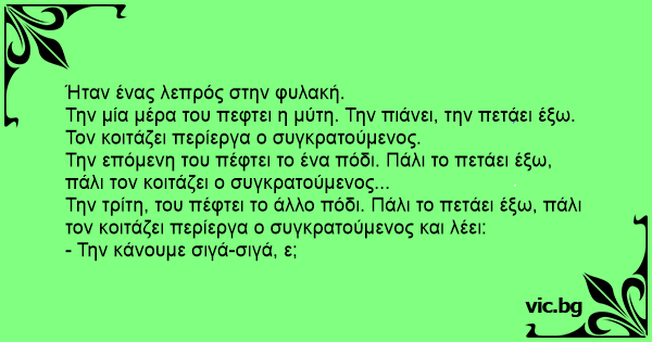 Την τρίτη, του πέφτει το άλλο πόδι. Πάλι το πετάει έξω, πάλι τον κοιτάζει περίεργα ο συγκρατούμενος και λέει: