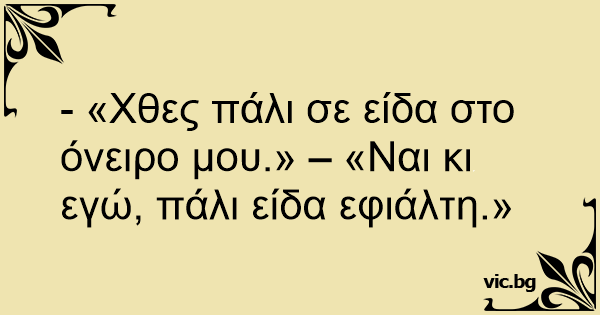- «Χθες πάλι σε είδα στο όνειρο μου.» – «Ναι κι εγώ, πάλι είδα εφιάλτη.»