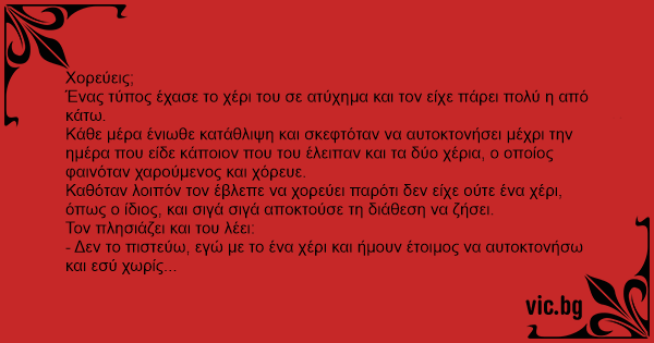 - Δεν το πιστεύω, εγώ με το ένα χέρι και ήμουν έτοιμος να αυτοκτονήσω και εσύ χωρίς χέρια και χορεύεις;
