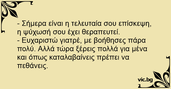 - Ευχαριστώ γιατρέ, με βοήθησες πάρα πολύ. Αλλά τώρα ξέρεις πολλά για μένα και όπως καταλαβαίνεις πρέπει να πεθάνεις.