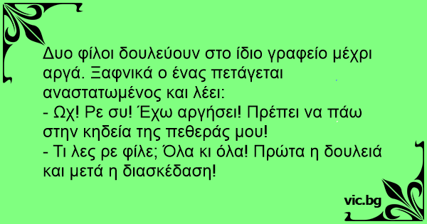 Δυο φίλοι δουλεύουν στο ίδιο γραφείο μέχρι αργά. Ξαφνικά ο ένας πετάγεται αναστατωμένος και λέει: