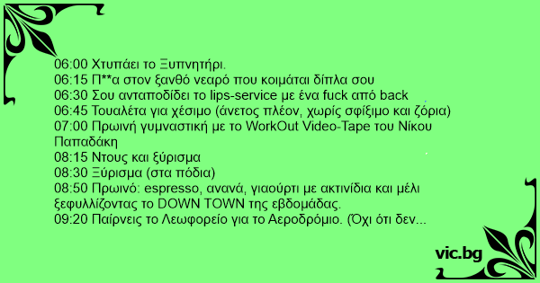 23:15 Χορεύεις πάνω στο Bar όπου σε χαζεύουν όλοι και κα***νεις με την ιδέα ότι οι μισοί απ αυτούς θα πάρουνε για χάρη σου απόψε δουλειά για το σπίτι.
