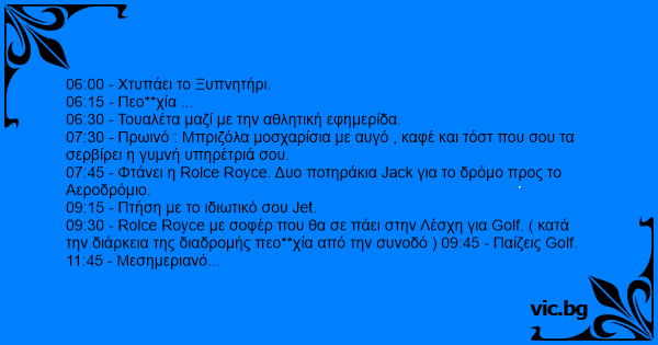 09:30 - Rolce Royce με σοφέρ που θα σε πάει στην Λέσχη για Golf. ( κατά την διάρκεια της διαδρομής πεο**χία από την συνοδό ) 09:45 - Παίζεις Golf.