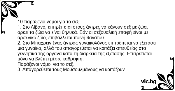 1. Στο Λίβανο, επιτρέπεται στους άντρες να κάνουν σεξ με ζώα, αρκεί τα ζώα να είναι θηλυκά. Εάν οι σεξουαλική επαφή είναι με αρσενικό ζώο, επιβάλλεται ποινή θανάτου.