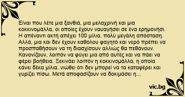Είναι που λέτε μια ξανθιά, μια μελαχρινή και μια κοκκινομάλλα, οι οποίες έχουν ναυαγήσει σε ένα ερημονήσι. Η απέναντι ακτή απέχει 100 μίλια, πολύ μεγάλη απόσταση.