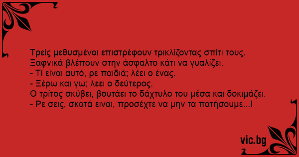 Τρείς μεθυσμένοι επιστρέφουν τρικλίζοντας σπίτι τους. Ξαφνικά βλέπουν στην άσφαλτο κάτι να γυαλίζει.