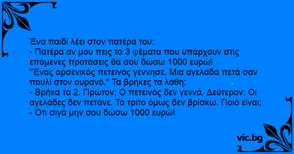- Πατέρα αν μου πεις τα 3 ψέματα που υπάρχουν στις επόμενες προτάσεις θα σου δώσω 1000 ευρώ!