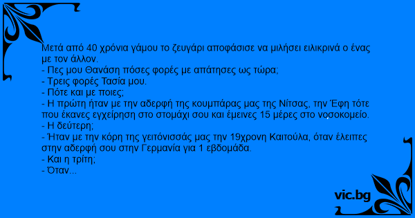 - Πες μου Θανάση πόσες φορές με απάτησες ως τώρα;