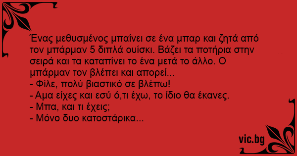 Ένας μεθυσμένος μπαίνει σε ένα μπαρ και ζητά από τον μπάρμαν 5 διπλά ουίσκι. Βάζει τα ποτήρια στην σειρά και τα καταπίνει το ένα μετά το άλλο. Ο μπάρμαν τον βλέπει και απορεί...