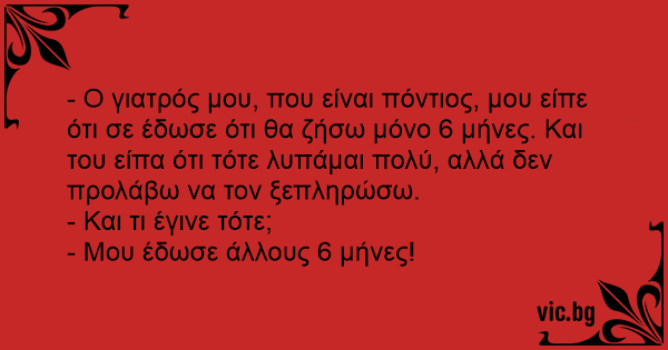 - Ο γιατρός μου, που είναι πόντιος, μου είπε ότι σε έδωσε ότι θα ζήσω μόνο 6 μήνες. Και του είπα ότι τότε λυπάμαι πολύ, αλλά δεν προλάβω να τον ξεπληρώσω.