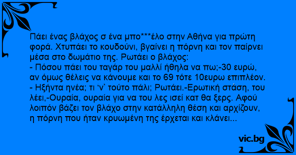 Πάει ένας βλάχος σ ένα μπο***έλο στην Αθήνα για πρώτη φορά. Χτυπάει το κουδούνι, βγαίνει η πόρνη και τον παίρνει μέσα στο δωμάτιο της. Ρωτάει ο βλάχος: