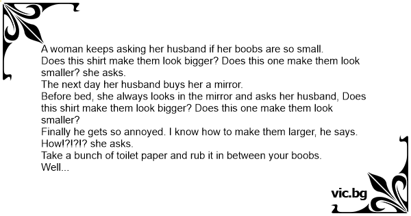 Nainen katseli itseään peilistä ja valitti miehelleen rintojensa pientä kokoa. Mies pääti piruilla vaimolleen ja sanoin "Jos haluat isommat rinnat ota vessapaperia ja hiero sitä rintoihisi joka...