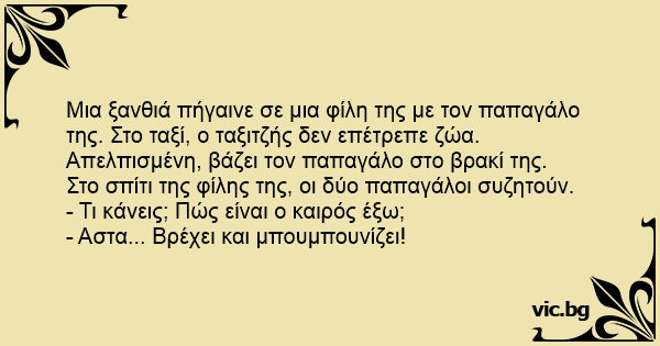 Μια ξανθιά πήγαινε σε μια φίλη της με τον παπαγάλο της. Στο ταξί, ο ταξιτζής δεν επέτρεπε ζώα. Απελπισμένη, βάζει τον παπαγάλο στο βρακί της.