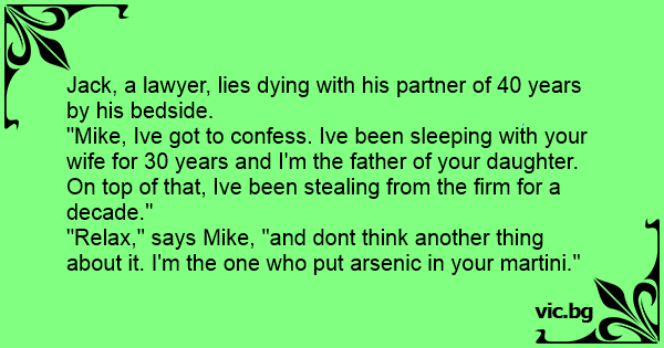 Ein Anwalt liegt im Sterben und hat seinen langjährigen Partner an seiner Seite sitzen: “Ich muss Dir etwas gestehen: Ich habe dreissig Jahre mit Deiner Frau ein Verhältnis gehabt und ich bin der...