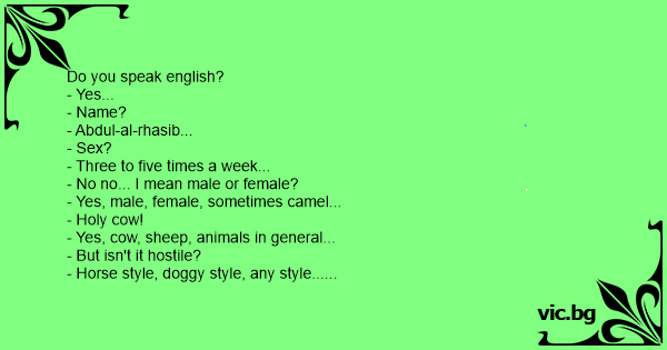 Interviewer: Αχμέτ Χουσεϊν Temel Amerika'ya gelir uçaktan iner pasaport olayı filan falan - Do you speak English? Reporter: "Excuse me, may I interview you?" — Qual o seu nome? "Name?" Neulich bei der Einwanderungsbehörde:,"Name?","Abu Dalah Sarafi.","Sex?","Four times a week.","No, no, no... male or female?","Male, female... sometimes camel..." No balcão da Alfandega: Seu nome ? Abu Abdalah Sarafi. Sexo? Quatro vezes por semana. Não, não, não! Homem ou mulher? Homem, mulher. Algumas vezes camelo. - Name? - Abdul Anubi al-Dzabiri. - Sex? - Four times a week - No, no, male or female? - Male, female, sometimes camel... En man som är dålig på engelska kommer in på en arbetsförmedling i Holland för att söka jobb! - Name - Abu Dalah Sarafi. - Sex? - Four times a week. - No, no, no, male or female? - Male,... Q: Your name please? A: Abdul Aziz Q: Sex? A: Yes. Two times every week. Q: No no. I mean, Male or Female? A: Not matter. Sometimes also camel ! An arab at the airport: - Name? - Abdul al-Rhazib. - Sex? - Three to five times a week. - No, no... I mean male or female? - Male, female, sometimes camel. - Holy cow! - Cow, sheep, animals in... An arab at the airport: - Name? - Abdul al Rahzib. - Sex? - Three to five times a week. - No, no...I mean Male or female? - Male, female, sometimes camel. - Holy cow! - Yes, cow, sheep,... Q: Naam? A: Abdul Asis Q: Sexe? A: Ja iedere week 2 keer. Q: Nee, ik bedoel man of vrouw? A: Maakt niet uit, soms ook kameel. En la oficina árabe le atienden por teléfono: - ¿Me dice su nombre, por favor? - Jawad Gadaff - ¿Sexo? - 1 vez al día, pero no siempre. - ¡No, hombre, no! Me refiero, ¿hombre o mujer? - Correcto,... All’Ufficio Immigrazioni: – Nome? – Mhoamhed. – Sesso? – 5 volte alla settimana. – Ma non in quel senso: maschio o femmina? – No importa, a volte anche con cammelli. Chiedono a Gheddafi: "ciao, nome?" e lui: "Gheddafi", e poi: "sesso?" e lui risponde: "cinque volte al giorno!" e loro chiedono: "con maschio o femmina?" e lui: "va bene anche cammello!". - NAME? - Muhjmatil Ahmed. - SEX? - Three times a week! - NO, I MEAN; MALE OR FEMALE? - Doesnt matter. Sometimes even with camel... - Name? - Abdul al-Rhazib. - Sex? - Three to five times a week. - No, no! I mean male or female? - Male, female, sometimes camel... - Holy cow! - Yes. Cow, sheep... animals in general. - But isn't... An Arab at the airport: - 'Name?' - 'Abdul al-Rhazib.' - 'Sex?' - 'Three to five times a week.' - 'No, no... I mean male or female?' - 'Male, female, sometimes camel.' - 'Holy cow!' - 'Yes, cow,...