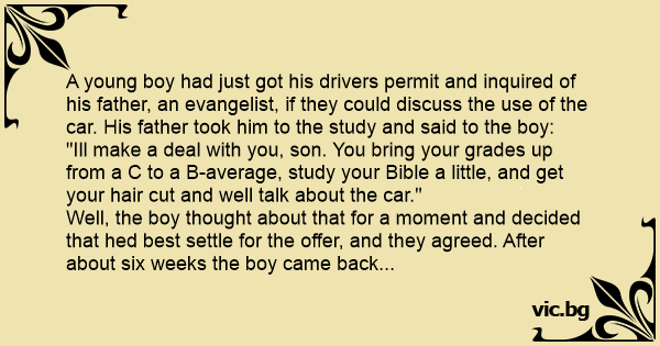 "Ill make a deal with you, son. You bring your grades up from a C to a B-average, study your Bible a little, and get your hair cut and well talk about the car."