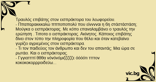 Μούγκα ο εισπράκτορας. Με κόπο επαναλαμβάνει ο τραυλός την ερώτηση . Τιποτα ο εισπράκτορας. Ακίνητος. Κάποιος επιβάτης δίνει στον τύπο την πληροφορία που θέλει και όταν κατεβαίνει γυρίζει αγριεμένος στον εισπράκτορα.