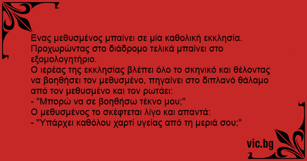 Ο ιερέας της εκκλησίας βλέπει όλο το σκηνικό και θέλοντας να βοηθήσει τον μεθυσμένο, πηγαίνει στο διπλανό θάλαμο από τον μεθυσμένο και τον ρωτάει: