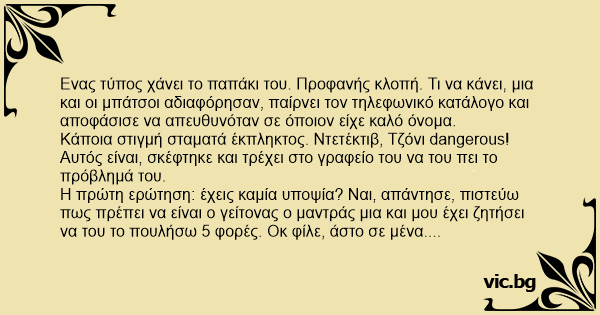 Eνας τύπος χάνει το παπάκι του. Προφανής κλοπή. Τι να κάνει, μια και οι μπάτσοι αδιαφόρησαν, παίρνει τον τηλεφωνικό κατάλογο και αποφάσισε να απευθυνόταν σε όποιον είχε καλό όνομα.